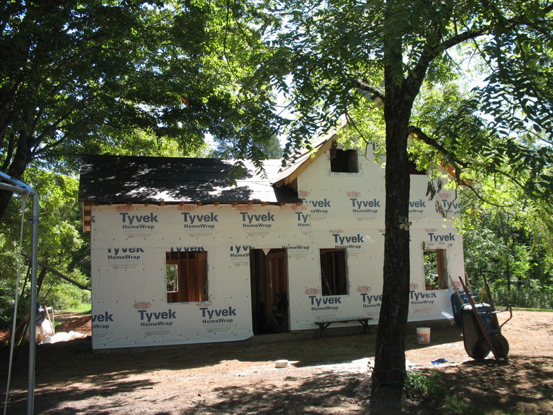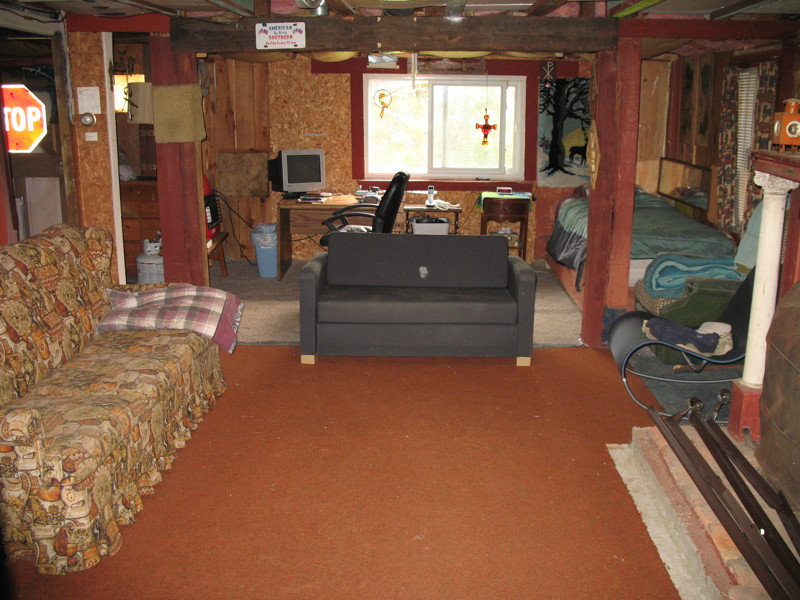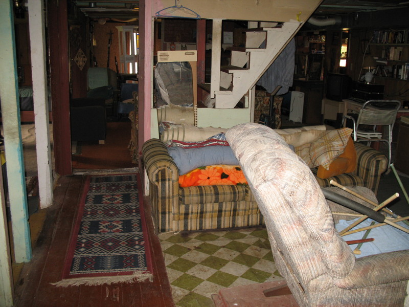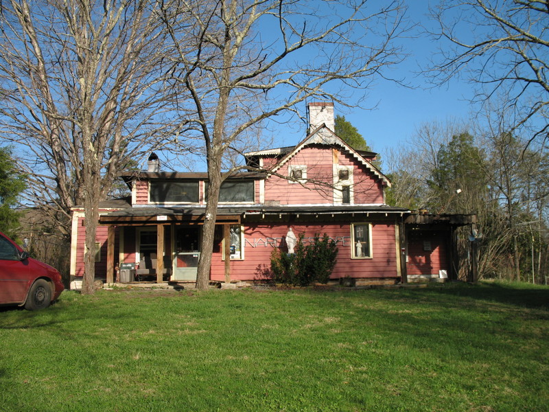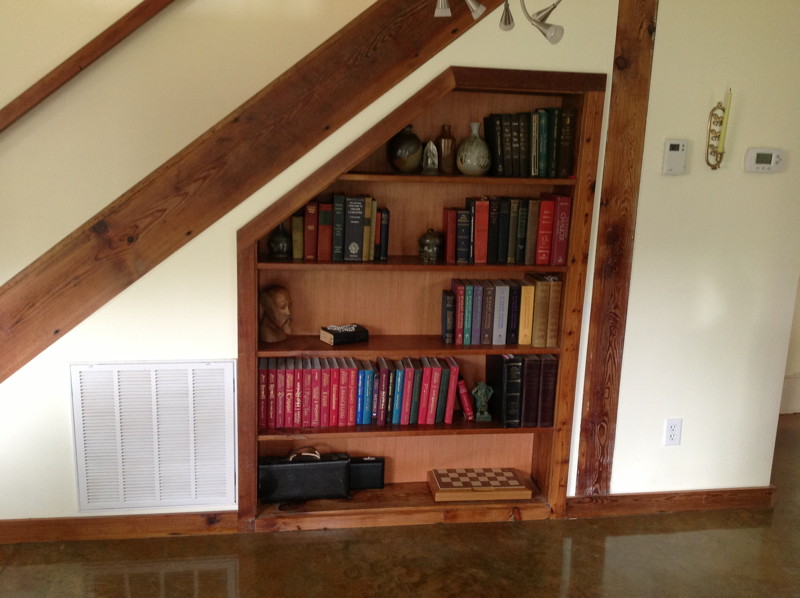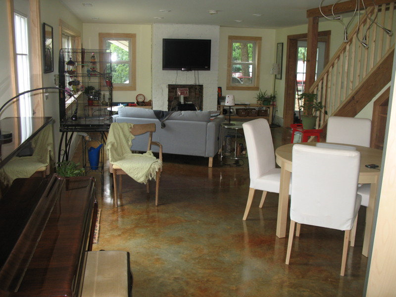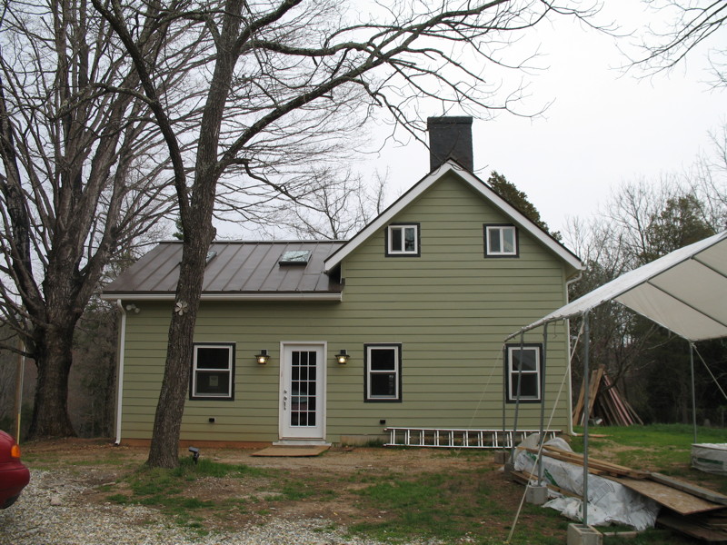 As part of the renovation, we demolished the old structure to its hand-hewn timberframe, replaced the entire rotted American Chestnut on stacked stone foundation, keeping one fireplace and the hand-hewn timbers framing up the original portion of the home. The flooring in the upstairs was repurposed and became the new staircase with an integrated bookshelf. We added a half bath upstairs, completing it with bamboo flooring upstairs and polished acid-stained concrete radiant-heated floors downstairs. A metal roof with eight skylights bring much-needed light into the upstairs and kitchen, removing alomost 1000 Sqft. of area, bringing the home back to the original house dimensions prior to 1970. A wrap-around porch is the next step in this project.