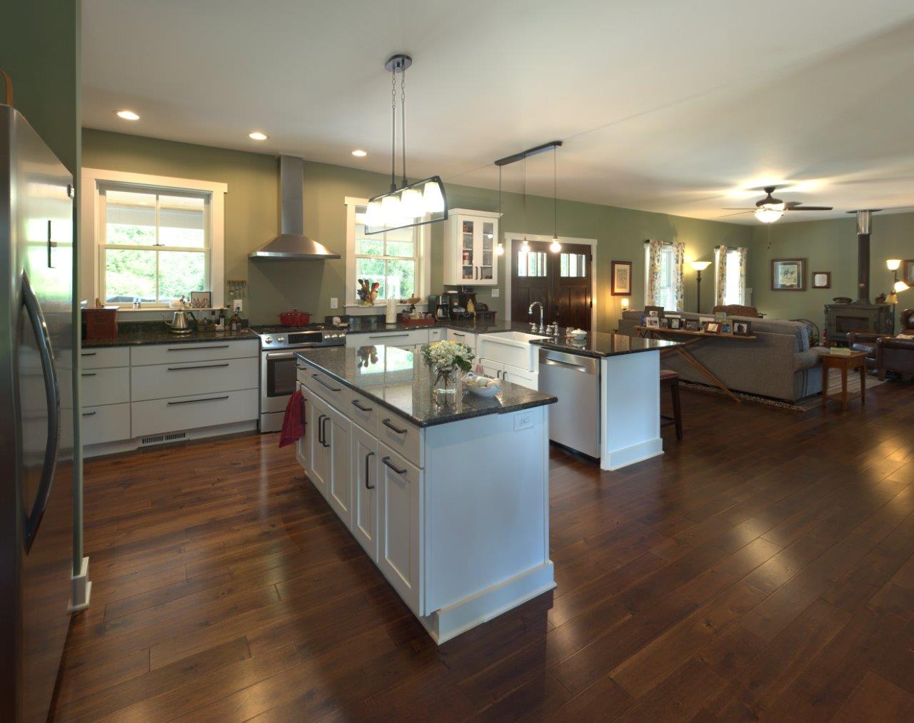 Custom Home: Built from the Owner's plans, this custom home's elongated layout fits the landscape and the needs of the family with the Master Suite and children and guest rooms situated on opposite ends of the house. The main living area is one large open room featuring kitchen, living and dining areas. Custom built-ins and a wood burning stove complete the space and keep it cozy. The home's exterior features generous covered porches front and back, and low maintenance cement board siding with battens to complete the look.